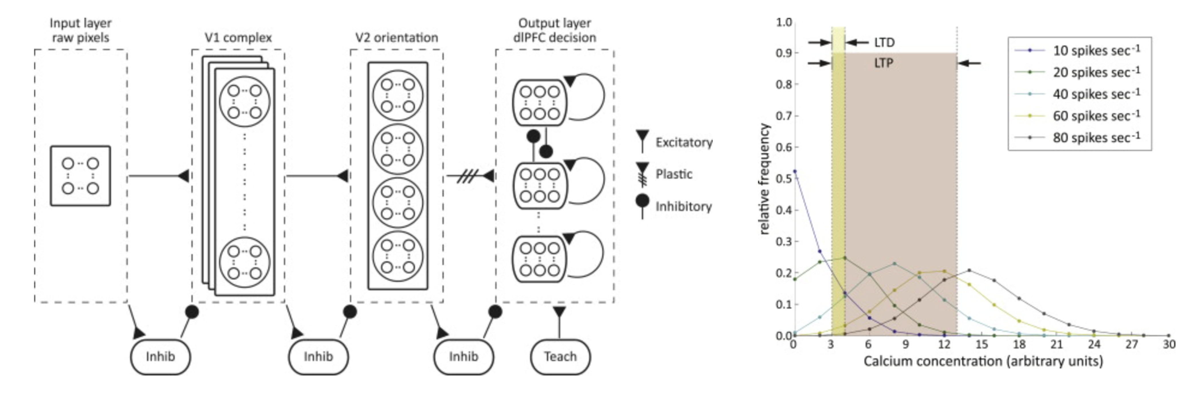 Understanding how the human brain is able to efficiently perceive and understand a visual scene is still a field of ongoing research. Although many studies have focused on the design and optimization of neural networks to solve visual recognition tasks, most of them either lack neurobiologically plausible learning rules or decision-making processes. Here we present a large-scale model of a hierarchical spiking neural network (SNN) that integrates a low-level memory encoding mechanism with a higher-level decision process to perform a visual classification task in real-time. The model consists of Izhikevich neurons and conductance-based synapses for realistic approximation of neuronal dynamics, a spike-timing-dependent plasticity (STDP) synaptic learning rule with additional synaptic dynamics for memory encoding, and an accumulator model for memory retrieval and categorization. The full network, which comprised 71,026 neurons and approximately 133 million synapses, ran in real-time on a single off-the-shelf graphics processing unit (GPU). The network was constructed on a publicly available SNN simulator that supports general-purpose neuromorphic computer chips. The network achieved 92% correct classifications on MNIST in 100 rounds of random sub-sampling, which is comparable to other SNN approaches and provides a conservative and reliable performance metric. Additionally, the model correctly predicted reaction times from psychophysical experiments. Because of the scalability of the approach and its neurobiological fidelity, the current model can be extended to an efficient neuromorphic implementation that supports more generalized object recognition and decision-making architectures found in the brain.