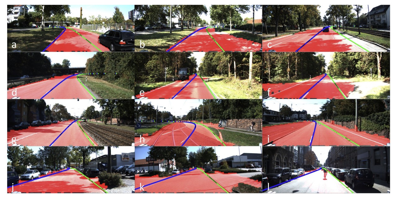 Road and lane detection play an important role in autonomous driving and commercial driver-assistance systems. Vision-based road detection is an essential step towards autonomous driving, yet a challenging task due to illumination and complexity of the visual scenery. Urban scenes may present additional challenges such as intersections, multi-lane scenarios, or clutter due to heavy traffic. This paper presents an integrative approach to ego-lane detection that aims to be as simple as possible to enable real-time computation while being able to adapt to a variety of urban and rural traffic scenarios. The approach at hand combines and extends a road segmentation method in an illumination-invariant color image, lane markings detection using a ridge operator, and road geometry estimation using RANdom SAmple Consensus (RANSAC). Employing the segmented road region as a prior for lane markings extraction significantly improves the execution time and success rate of the RANSAC algorithm, and makes the detection of weakly pronounced ridge structures computationally tractable, thus enabling ego-lane detection even in the absence of lane markings. Segmentation performance is shown to increase when moving from a color-based to a histogram correlation-based model. The power and robustness of this algorithm has been demonstrated in a car simulation system as well as in the challenging KITTI data base of real-world urban traffic scenarios.