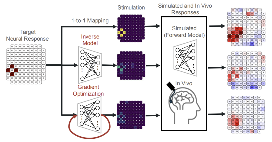 Visual cortical prostheses offer a promising path to sight restoration, but current systems elicit crude, variable percepts and rely on manual electrode-by-electrode calibration that does not scale. This work introduces an automated data-driven neural control method for a visual neuroprosthesis using a deep learning framework to generate optimal multi-electrode stimulation patterns that evoke targeted neural responses. Using a 96-channel Utah electrode array implanted in the occipital cortex of a blind participant, we trained a deep neural network to predict single-trial evoked responses. The network was used in two complementary control strategies: a learned inverse network for real-time stimulation synthesis and a gradient-based optimizer for precise targeting of desired neural responses. Both approaches significantly outperformed conventional methods in controlling neural activity, required lower stimulation currents, and adapted stimulation parameters to resting state data, reliably evoking more stable percepts. Crucially, recorded neural responses better predicted perceptual outcomes than stimulation parameters alone, underscoring the value of our neural population control framework. This work demonstrates the feasibility of data-driven neural control in a human implant and offers a foundation for next-generation, model-driven neuroprosthetic systems, capable of enhancing sensory restoration across a range of clinical applications.