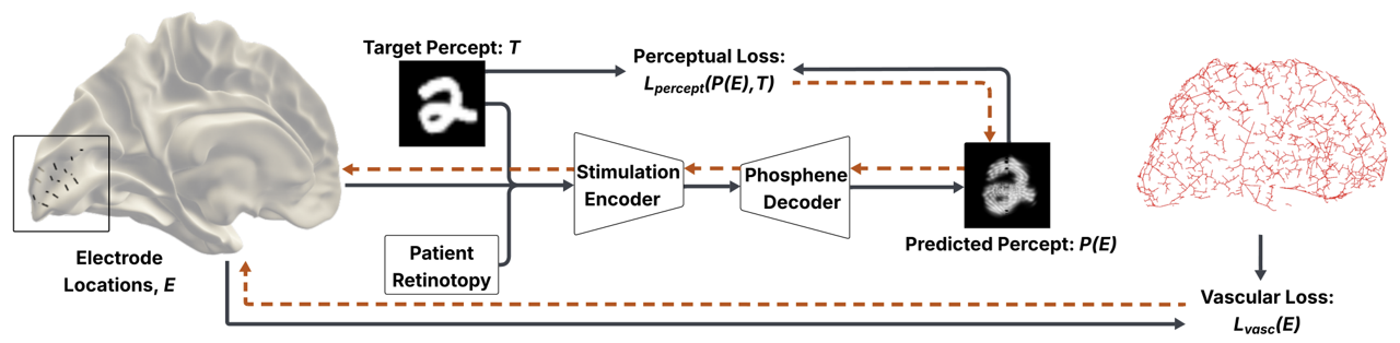 Cortical visual prostheses aim to restore sight by electrically stimulating neurons in early visual cortex (V1). With the emergence of high-density and flexible neural interfaces, electrode placement within three-dimensional cortex has become a critical surgical planning problem. Existing strategies emphasize visual field coverage and anatomical heuristics but do not directly optimize predicted perceptual outcomes under safety constraints. We present a percept-aware framework for surgical planning of cortical visual prostheses that formulates electrode placement as a constrained optimization problem in anatomical space. Electrode coordinates are treated as learnable parameters and optimized end-to-end using a differentiable forward model of prosthetic vision. The objective minimizes task-level perceptual error while incorporating vascular avoidance and gray matter feasibility constraints. Evaluated on simulated reading and natural image tasks using realistic folded cortical geometry (FreeSurfer fsaverage), percept-aware optimization consistently improves reconstruction fidelity relative to coverage-based placement strategies. Importantly, vascular safety constraints eliminate margin violations while preserving perceptual performance. The framework further enables co-optimization of multi-electrode thread configurations under fixed insertion budgets. These results demonstrate how differentiable percept models can inform anatomically grounded, safety-aware computer-assisted planning for cortical neural interfaces and provide a foundation for optimizing next-generation visual prostheses.
